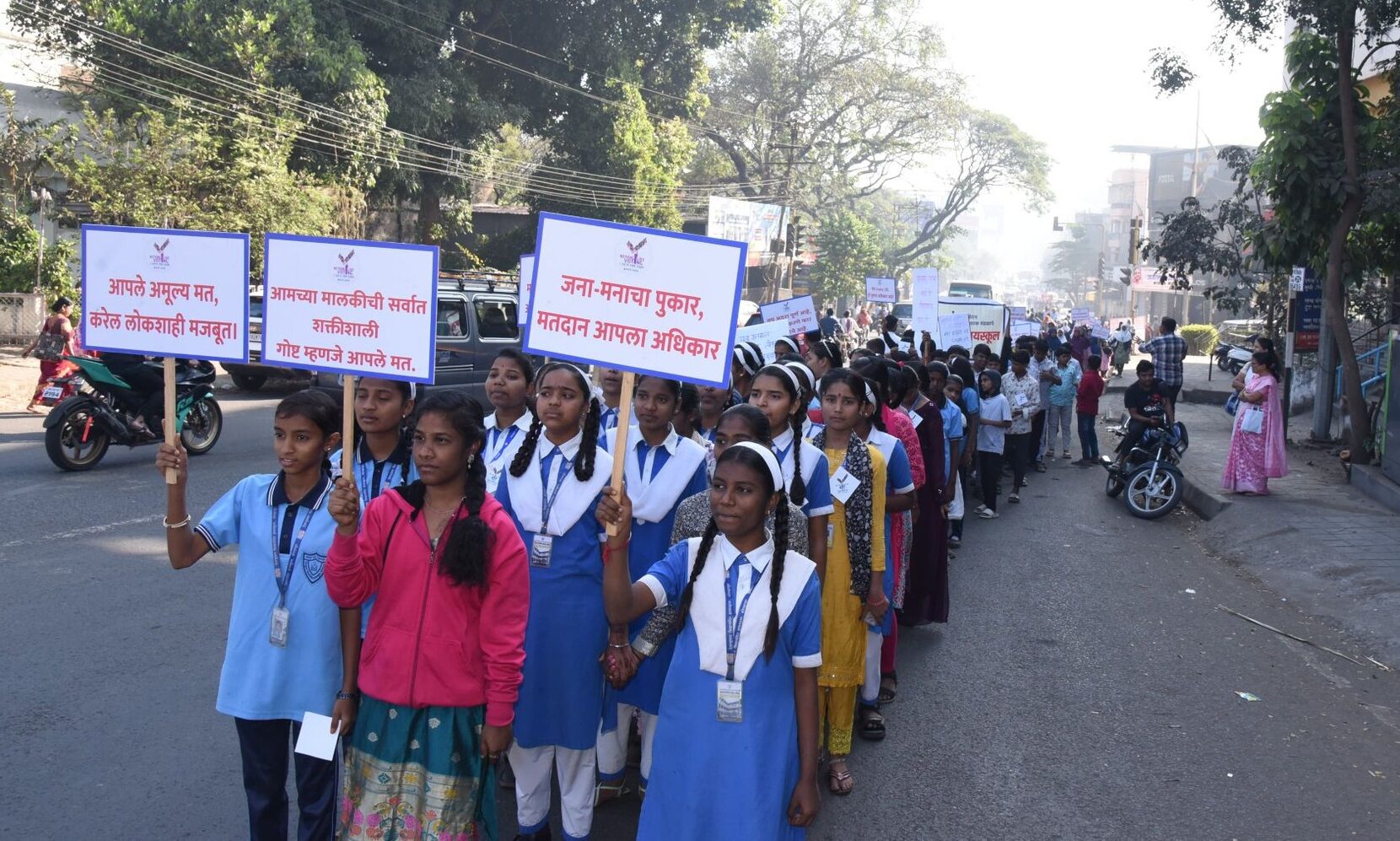“मतदार राजा जागा हो; लोकशाहीचा धागा हो ! “मतदान आमचे – राष्ट्रीय कर्तव्य, मत द्या – आपला आवाज ऐकू द्या ! , “जना – मनाची पुकार मतदान आपला अधिकार” यासारख्या घोषणा विद्यार्थ्यांनी दिल्या. ही रॅली जिल्हाधिकारी कार्यालय , पॅव्हेलियन / सायबा हॉटेल, दसरा चौक मार्गे श्री शहाजी छत्रपती महाविद्यालय येथे विसर्जित करण्यात आली. या रॅलीत देशभूषण, दादासो मगदूम, होली क्रॉस, नेहरू व राजश्री शाहू हायस्कूलच्या विद्यार्थ्यांनी सहभाग नोंदवला. यावेळी करवीर तहसीलदार स्वप्निल रावडे, निवडणूक तहसीलदार महेश खिलारी, नायब तहसीलदार सर्वश्री जयंत गुरव, बी. बी. बोडके, शिवाजी गवळी, पी. जी. पाटील यांच्यासह इतर शाळांचे शिक्षक शिक्षकेत्तर कर्मचारी मोठ्या संख्येने उपस्थित होते.